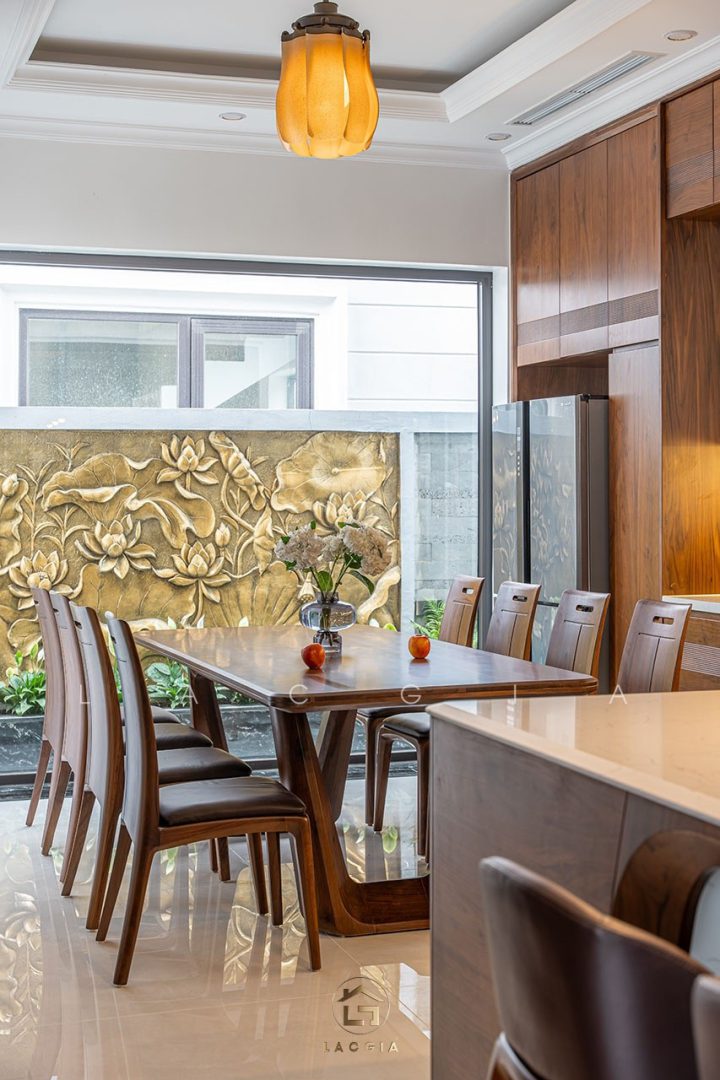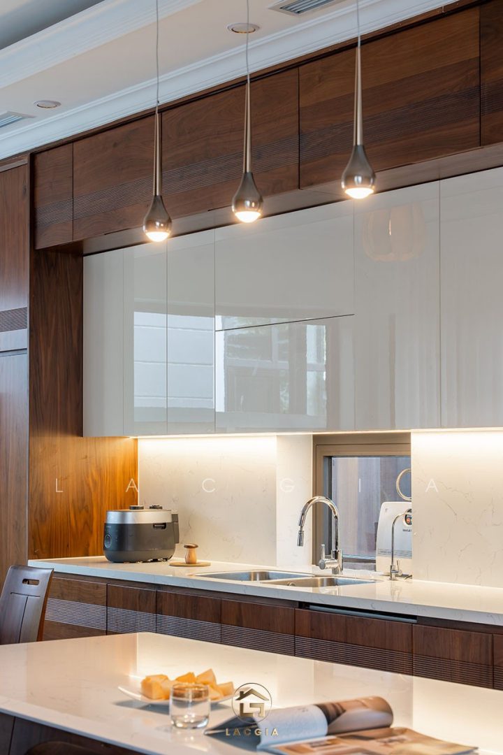 - Ánh sáng: Tận dụng ánh sáng tự nhiên và hệ thống đèn LED âm tủ để làm nổi bật vân gỗ quý.