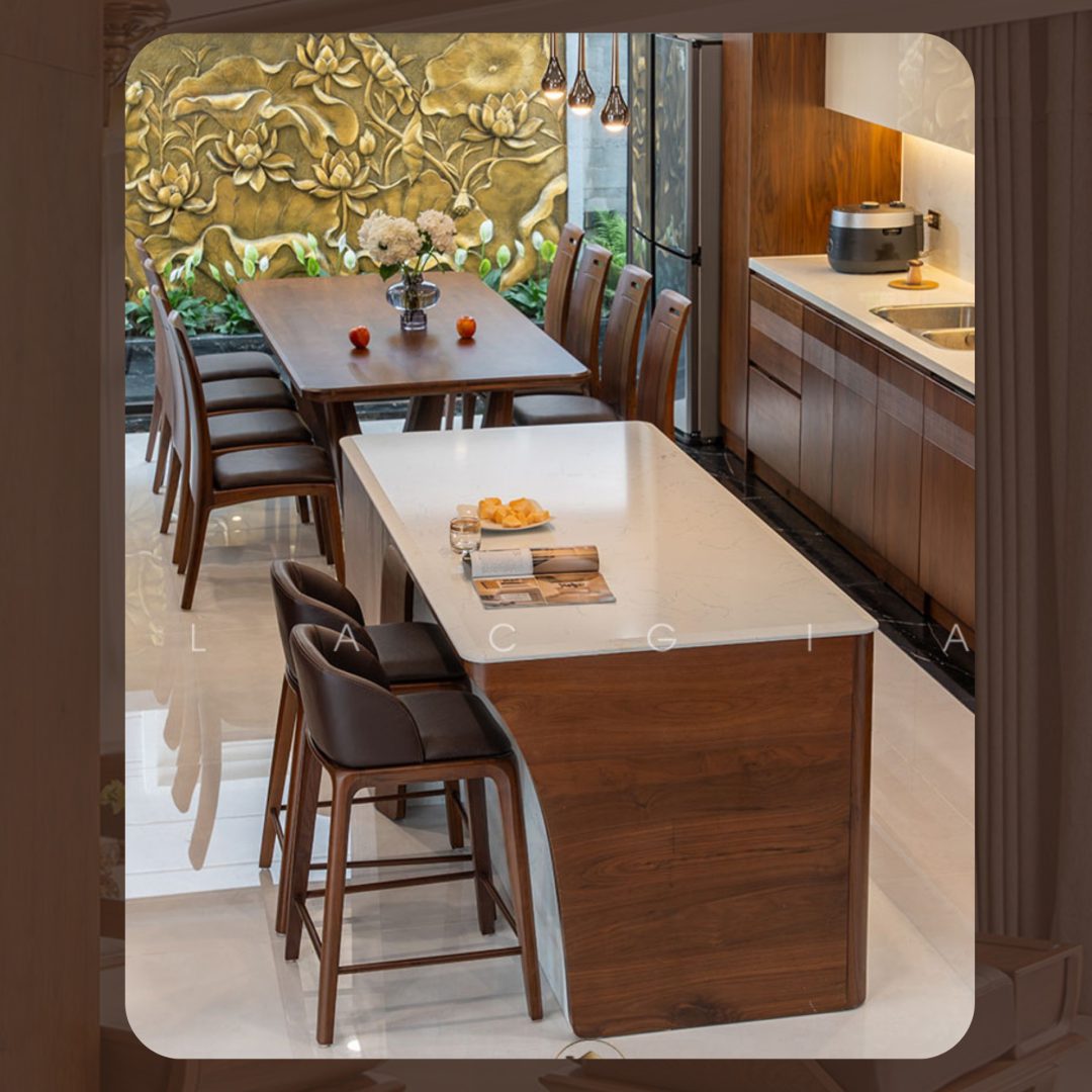 Đảo bếp không chỉ là nơi chuẩn bị thực phẩm mà còn có thể biến tấu thành bàn quầy bar mini hoặc bàn ăn nhanh. Sử dụng mặt đá thạch anh cao cấp kết hợp với chân gỗ óc chó tạo nên sự tương phản đầy tinh tế.